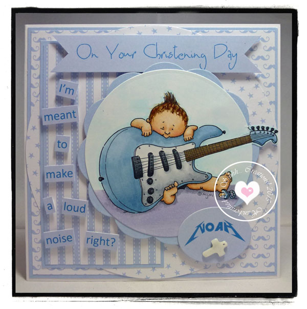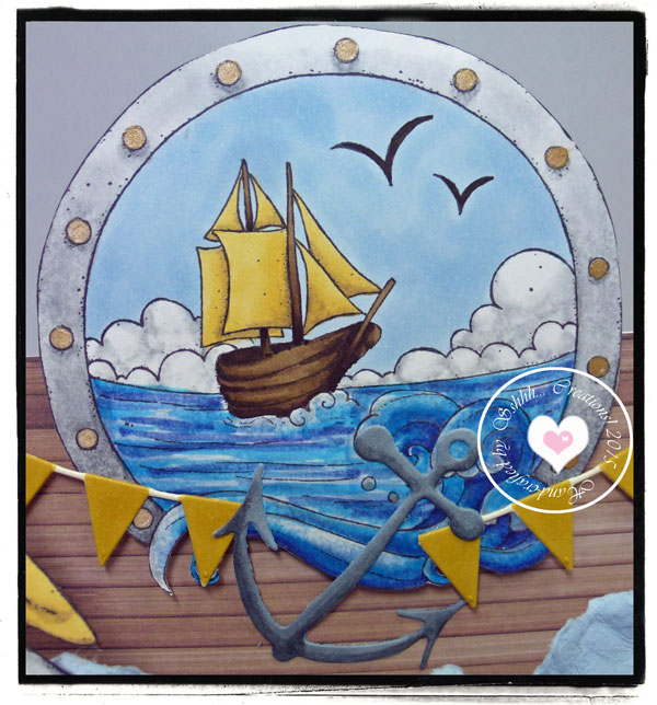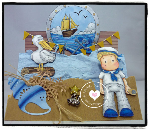 I used 3 Magnolia stamps on my card, Edwin, the Pelican and the porthole. I used the following Copics: Skin;E21,13,00,0000,R20. Hair, sails, bill;E44,Y23,21. Shoes, collar, hat, sea; B39,37,34,06. Sky'B91. Log, boat;E49,47,44,43,42. Suit, Pelican, clouds, frame;N5,3,1. And the blender. I also added some Gellyroll clear and gold pen to highlight.